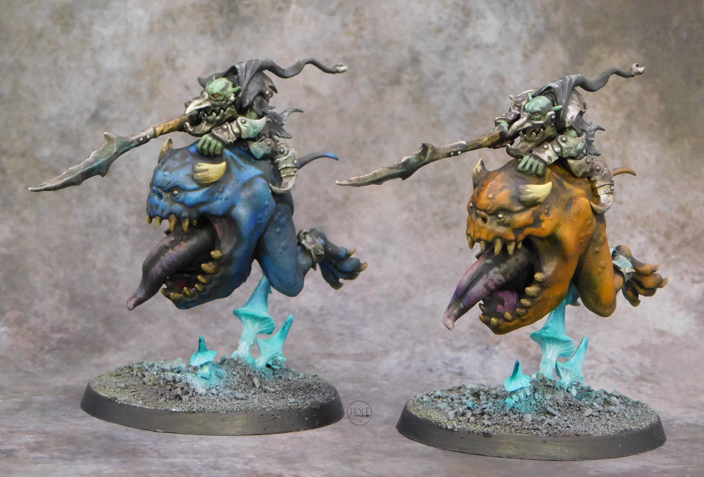 Games Workshop Warhammer Age of Sigmar Loonbosses on Giant Cave Squigs from the Gloomspite Gitz army painted on commission.