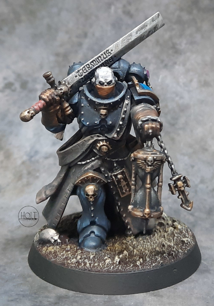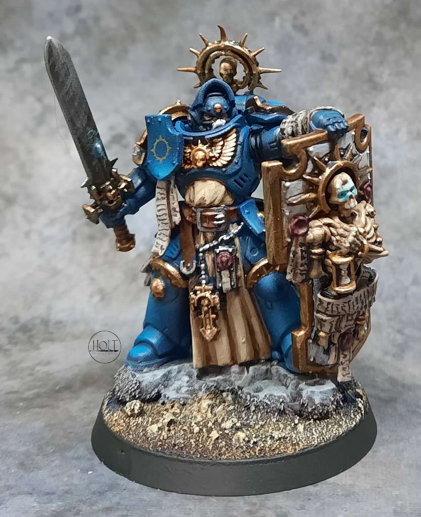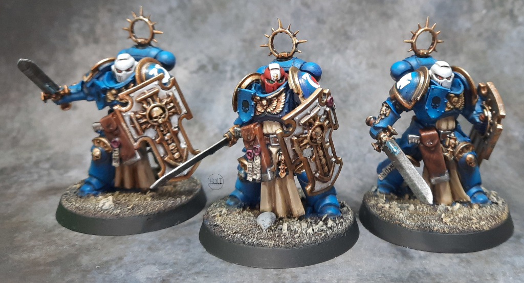 Space Marines: Honored of the Chapter character models and Bladeguard Veterans painted in the Ultramarine chapter for the game Warhammer 40,000 by Games Workshop.
