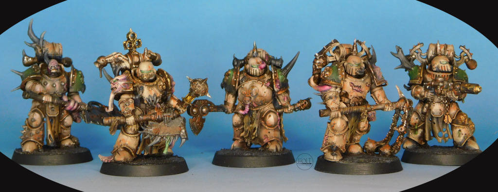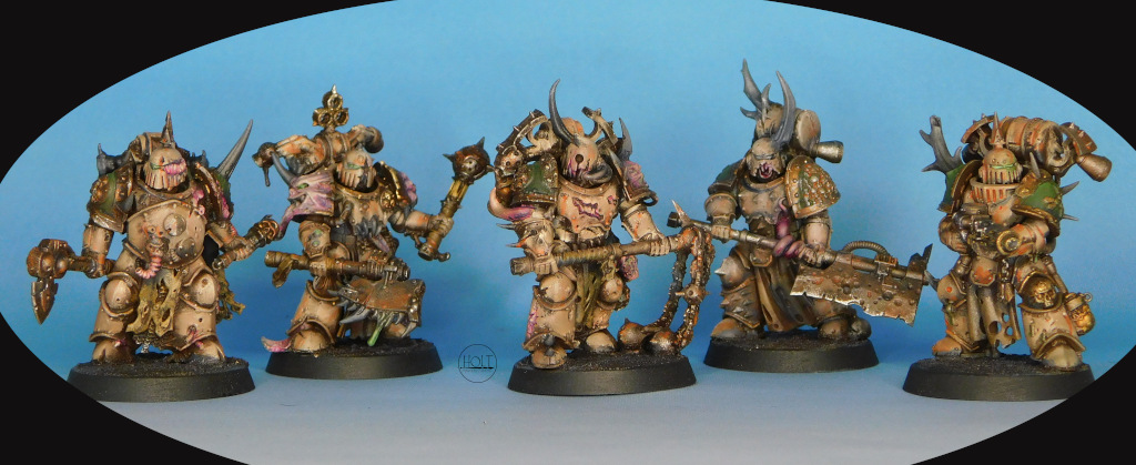 Warhammer 40,000 Death Guard reinforcements for an ongoing army project. Painted on commission in the alternate Pale Bone Armor with oils.