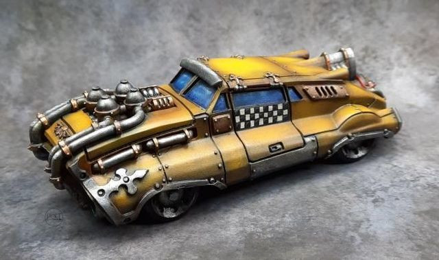 Grim Skull Miniatures Imperial Hive Runner MK-V painted as a Taxicab of the Far Future. Painted on commission with Oils and Acrylics. A great model to start the new year.