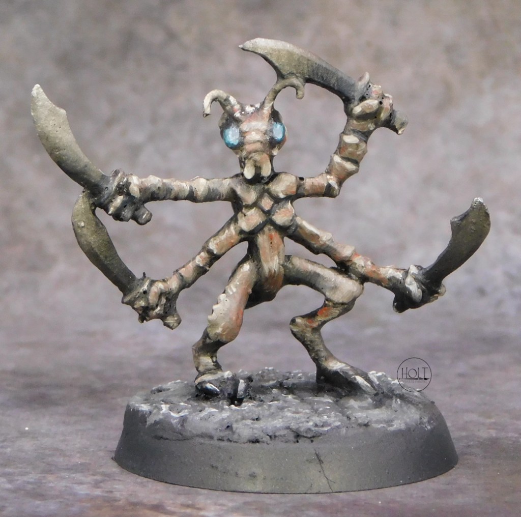 Thri-Kreen painted in oils. Based off of an Out of Production metal “Mantis” model from Reaper Miniatures.